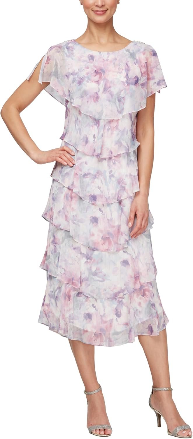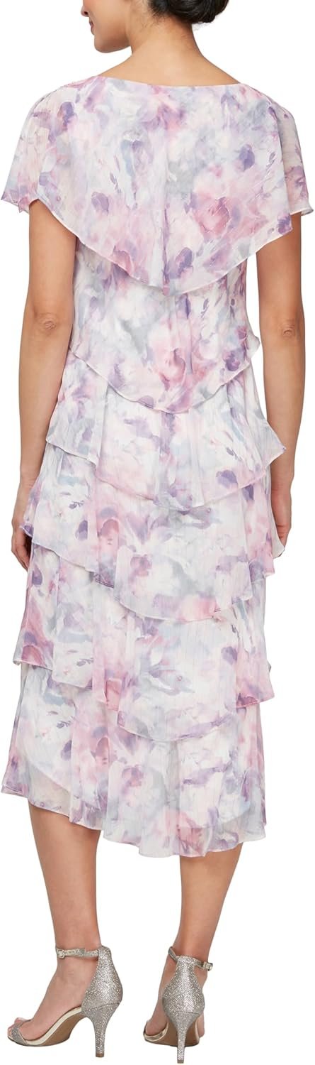 - Airy Sophistication: Embrace style with our midi printed tier dress, crafted from lurex chiffon for a non-etchy, lightweight feel. Elevate your look with shoulder embellishments, seamlesy combining comfort and flair.
