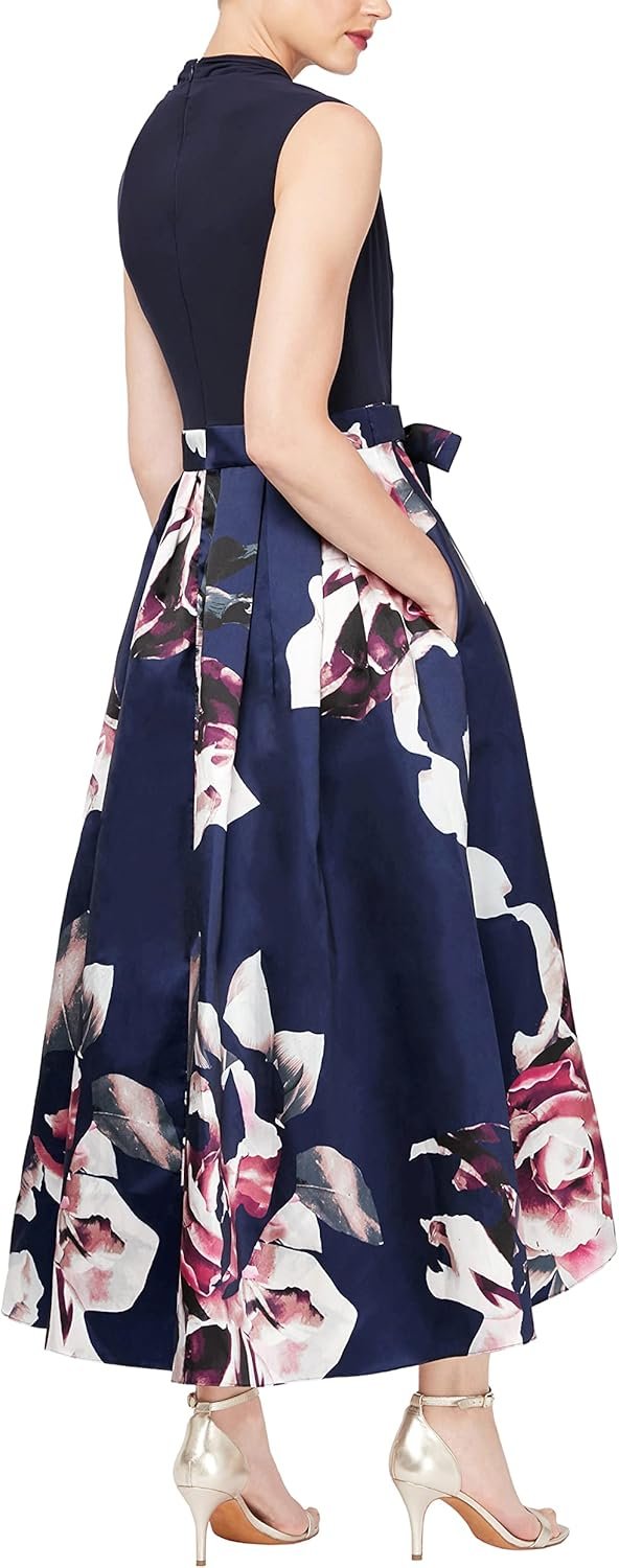 • Elegant Design: Women’s less V-Neck Hi-lo Floral Wedding Guest Gown features a chic etch jersey V-neck bodice and an allover floral printed Mikado pleated skirt with a self-tie belt.